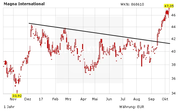 Magna wurde bereits in der aktuellen Ausgabe des AKTIONÄR „Das All-Star-Depot“ vorgestellt und zum Kauf empfohlen. Die Kanadier machten zuletzt durch Gerüchte auf sich aufmerksam, nach denen sie Tesla bei der Errichtung eines Produktionsstandortes des Model 3 in Europa unterstützen sollen. Zudem begann man jüngst mit dem Bau einer neuen Lackieranlage in Slovenien, die 2018 fertig gestellt werden soll und 400 neue Arbeitsplätze schafft. Des Weiteren ist das kanadische Unternehmen mit einem KGV von 8 noch sehr günstig bewertet.
