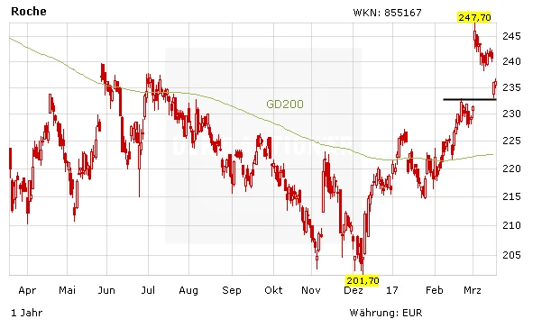 Im Geschäftsjahr 2016 gelang es Roche, den Umsatz zu konstanten Wechselkursen um vier Prozent auf 50,6 Milliarden Franken zu steigern. Der Konzerngewinn kletterte um fünf Prozent auf 18,4 Milliarden Franken. Für 2017 rechnet Roche zu konstanten Wechselkursen mit einem Verkaufszuwachs im niedrigen bis mittleren einstelligen Bereich. Zudem wird ein Wachstum des Kerngewinns je Titel angestrebt, das weitgehend dem Verkaufswachstum entspricht. Roche plant des Weiteren, die Dividende in Schweizer Franken weiter zu erhöhen. Zuletzt wurde eine Anhebung auf 8,20 Franken angekündigt, womit das jahrelange Dividendenwachstum fortgesetzt würde.