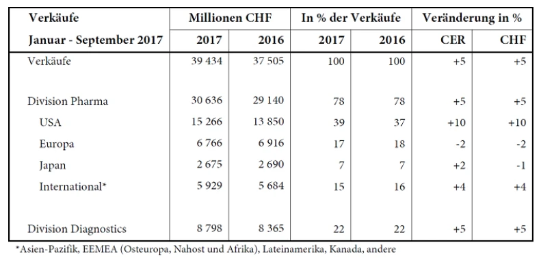 Der Pharmakonzern Roche sieht sich dank guter Geschäfte mit neuen Produkten weiterhin im Aufwind und auf Kurs zu seinen Jahreszielen. In den ersten neun Monaten steigerten die Schweizer den Umsatz im Vergleich zum Vorjahreszeitraum um fünf Prozent auf gut 39,4 Milliarden Schweizer Franken (knapp 34,2 Milliarden Euro). Schub kam vor allem von den neu auf den Markt gebrachten Medikamenten. Damit erfüllte Roche die Erwartungen der Analysten. Für das laufende Jahr bestätigte Konzernchef Severin Schwan die erst im Sommer erhöhten Prognosen: Auf Basis bereinigter Wechselkurse geht er weiterhin von einem Wachstum im mittleren einstelligen Prozentbereich aus. Hauptwachstumsträger im Bereich Pharma seien die neu eingeführten Medikamente Tecentriq, Ocrevus und Perjeta. Besonders erfreulich seien die kürzlich erfolgten Zulassungen von Tecentriq, Gazyvaro und RoActemra in der EU, so Schwan. Zudem kündigte Roche an, die Dividende weiter erhöhen zu wollen. Derzeit gehört Roche mit einer Dividendenrendite von 3,3 Prozent zu den stärksten Dividendenzahler im Schweizer Index SMI.