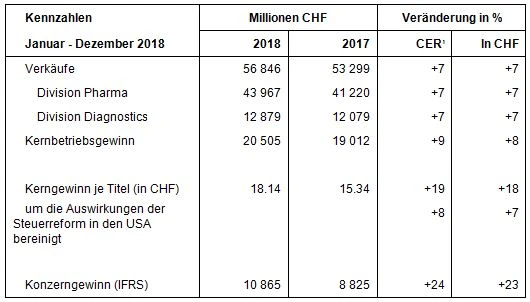 Die Konzernverkäufe stiegen zu konstanten Wechselkursen um sieben Prozent auf 56,8 Milliarden Schweizer Franken. Die wichtigsten Wachstumstreiber waren in der Division Pharma das neue Medikament Ocrevus zur Behandlung von zwei Formen der multiplen Sklerose sowie die Krebsmedikamente Perjeta, Tecentriq und Alecensa. Hemlibra für die Behandlung von Hämophilie A trug ebenfalls erheblich zum Wachstum bei. Mit Verkäufen von 2,4 Milliarden Franken im ersten vollständigen Geschäftsjahr ist Ocrevus die bislang erfolgreichste Produkteinführung in der Geschichte von Roche, so der Konzern in einer Mitteilung. In der Division Diagnostik konnte vor allem der Bereich Immundiagnostik überzeugen. Der Kerngewinn je Aktie stieg um 19 Prozent auf 18,14 Schweizer Franken. Gleichzeitig kündigte Roche eine Erhöhung der Dividende von 8,30 Franken im Vorjahr auf 8,70 Franken je Anteilschein an. Dies entspricht beim derzeitigen Kurs einer Dividendenrendite von 3,3 Prozent.