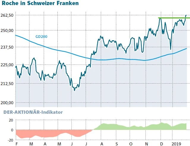 Die Aktie von Roche kann am Donnerstag kräftig zulegen, nachdem der Konzern ein starkes Jahresergebnis veröffentlicht hat. Knapp zwei Prozent geht es nach oben auf 262,20 Schweizer Franken. Damit ist der Aktie der Sprung auf ein neues 52-Wochenhoch gelungen und damit ein Kaufsignal. Und auch die kleine Kursdelle infolge des Studienstopps des Alzheimer-Projekts Crenezumab ist damit bereits wieder ausgemerzt.