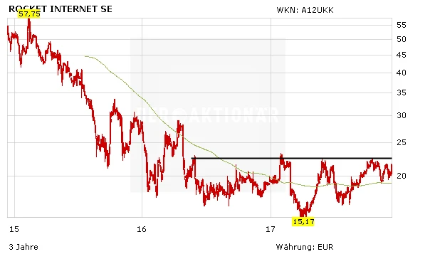 Zwar ist die Aktie von Rocket Internet seit Jahresanfang um rund elf Prozent gestiegen, trotzdem sind viele Anleger mit der Performance unzufrieden. Seit über einem Jahr pendelt der Kurs seitwärts, im Bereich von 22,50 scheint derzeit ein Deckel drauf zu sein. Der Kurs notiert damit deutlich unter dem Ausgabekurs von 42,50 Euro und rund 65 Prozent unter dem bisherigen Allzeithoch.
