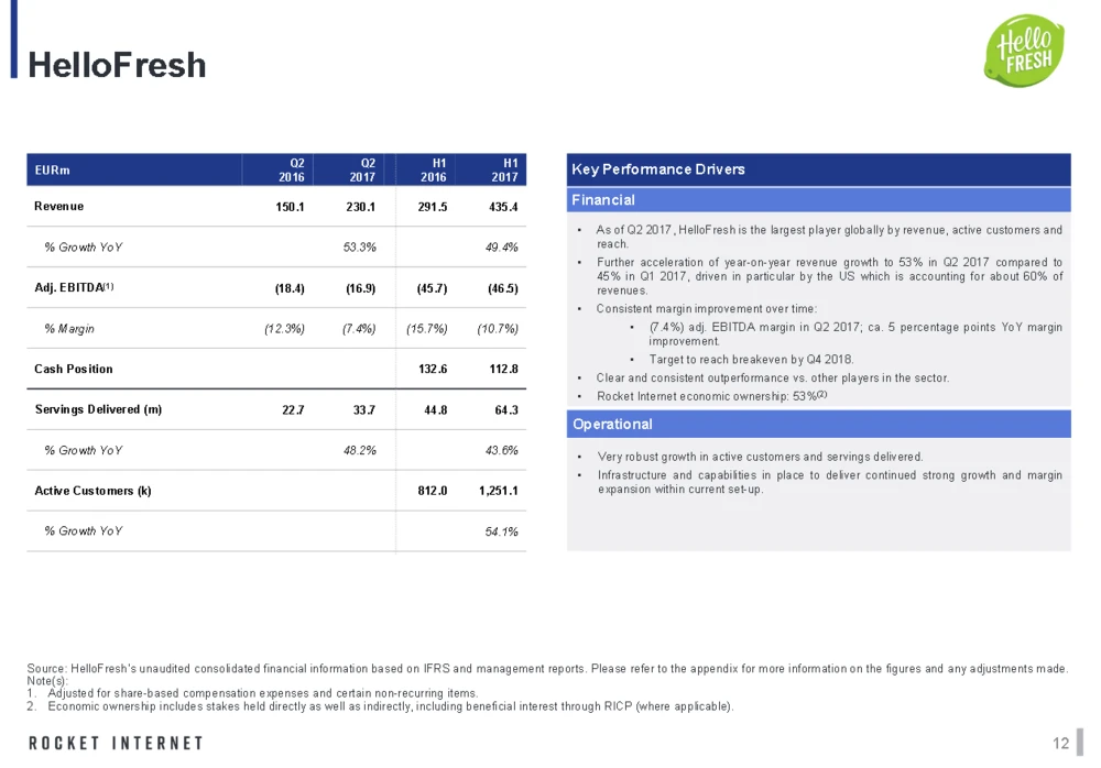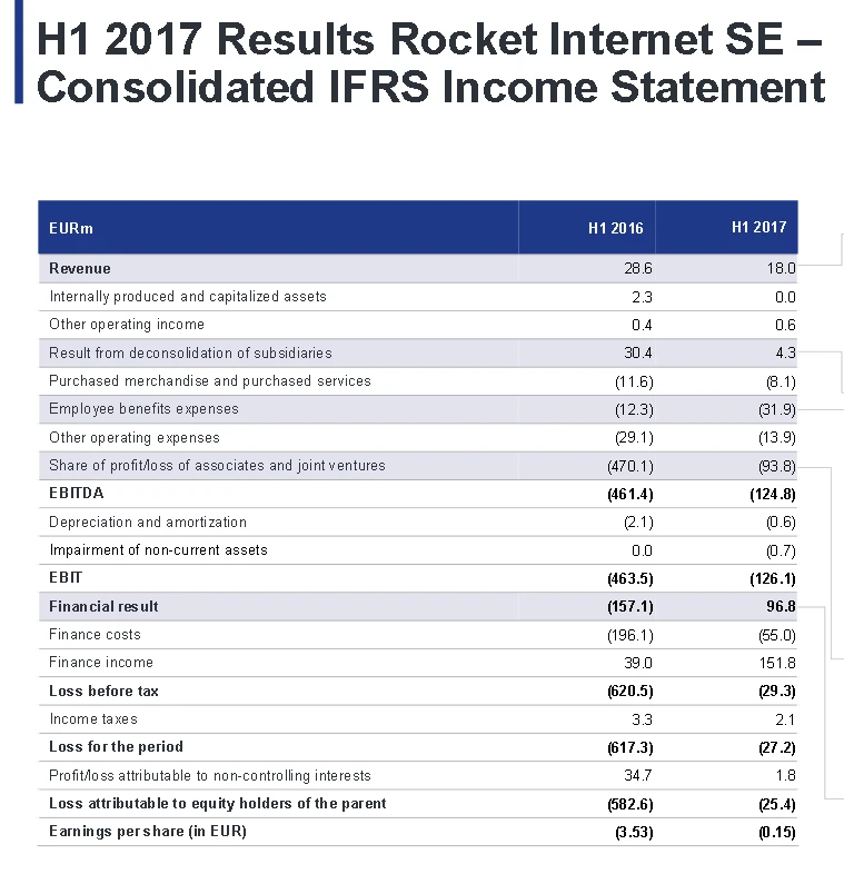 Neben der Meldung über den Teilrückzug bei Delivery Hero hat Rocket am Morgen auch die Zwischenbilanz für das erste Halbjahr präsentiert. Mit 18 Millionen Euro ist Umsatz unter anderem wegen Verkäufen und Dekonsolidierung von Beteiligungen zwar schmaler ausgefallen als im Vorjahreszeitraum (H1/16: 28,6 Millionen Euro), der konsolidierte Verlust ist aber trotzdem stark zurückgegangen: Nach minus 617 Millionen Euro im ersten Halbjahr 2016 standen diesmal nur noch minus 27 Millionen Euro zu Buche. Die Netto-Cash-Position lag am 31. August bei 1,6 Milliarden Euro.