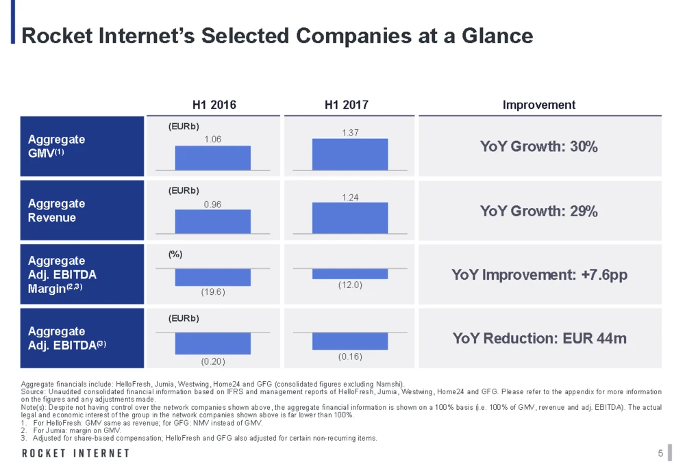 Fortschritte gab es auch bei den ausgewählten Portfolio-Unternehmen, zu denen Rocket sich im Halbjahresbericht äußert. Deren aggregierter Umsatz ist demnach um 29 Prozent auf 1,24 Milliarden Euro gestiegen. Die aggregierte bereinigte EBITDA-Marge verbesserte sich von minus 19,6 Prozent im Vorjahreszeitraum auf minus 12,0 Prozent in H1/2017. Die aggregierten bereinigten EBITDA-Verluste verringerten sich im ersten Halbjahr 2017 um 44 Millionen Euro auf minus 161 Millionen Euro.