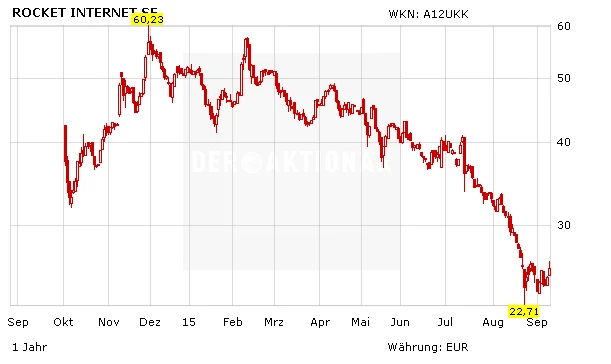 Auf den ersten Blick verheißt der Chart von Rocket Internet nichts Gutes: Nach dem IPO im Oktober 2014 zum Ausgabepreis von 42,50 Euro ging es zunächst aufwärts – im November markierte die Aktie bei 60 Euro ein Allzeithoch. Seitdem ging es aber rapide bergab. Allein zwischen Juli und September hat die Aktie knapp 40 Prozent an Wert verloren.