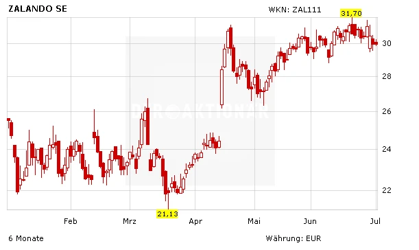 Zuletzt ist die Aktie von Zalando auf ein neues Allzeithoch bei 31,70 Euro gestiegen, inzwischen aber wieder unter das frühere Hoch vom April zurückgerutscht. Aus charttechnischer Sicht würde erst der nachhaltige Ausbruch darüber für ein Kaufsignal sorgen. Allerdings ist die Aktie weiterhin enorm hoch bewertet, weswegen die Aktie nur für risikobereite Anleger geeignet ist.