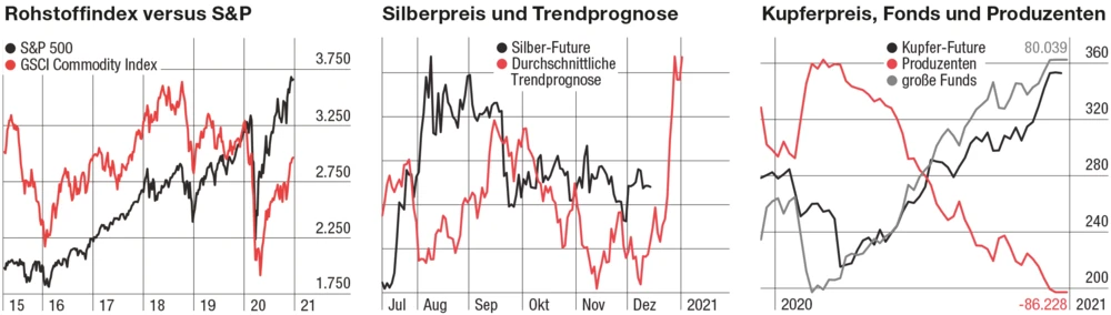 Morgan Stanley geht für das Jahr 2021 von weiteren 2,8 Billionen Dollar zusätzlicher Liquidität aus, die von den Notenbanken in die Märkte gepumpt werden. Diese inflationären Tendenzen sowie ein schwächerer US-Dollar sollten gerade den Rohstoffen einen weiteren Auftrieb bescheren. Die wirtschaftliche Erholung von China zeigt aktuell keine Schwäche, die Wachstumsprognosen des BIP für 2021 liegen mittlerweile deutlich über 2018/19 und wirken sich unmittelbar auf die Rohstoffpreise aus. Die Folge: China importiert wieder mehr Öl und der Crude Oil Future ist seit seinen Tiefstständen Anfang November um fast 40 Prozent gestiegen.