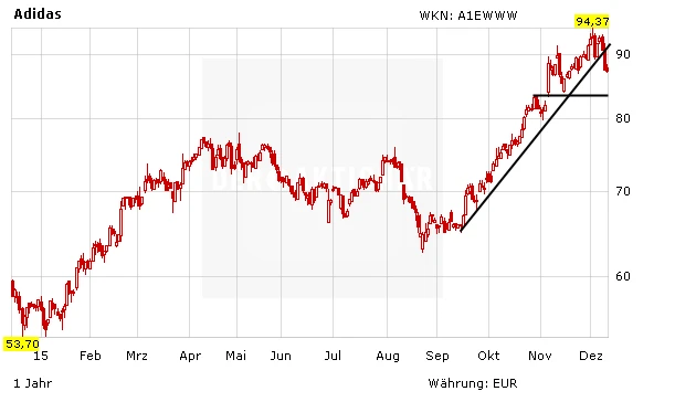 Es gibt allerdings auch weniger optimistische Stimmen. JPMorgan-Analystin Chiara Battistini erwartet für 2016 erheblichen Gegenwind durch Wechselkurseinflüsse. Sie stuft Adidas nur auf „Neutral“ ein. Ähnlich sieht es Andreas Riemann von der Commerzbank, der die Aktie auf „Hold“ mit Kursziel 86 Euro einstuft. Der Sportartikelhersteller habe seine Ziele für 2016 bestätigt und sich genauer zum Margendruck im nächsten Jahr geäußert, so der Experte. Die Veränderungen beim Produktmix könnten die erwarteten negativen Wechselkurseffekte nur zum Teil ausgleichen.