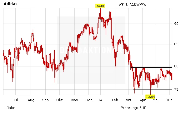Am Donnerstag ist Adidas das Schlusslicht im DAX. Die Bodenbildung der Aktie ist damit nach wie vor nicht abgeschlossen. Die 80-Euro-Marke rückt wieder in weitere Entfernung. Erst mit einem Sprung über diese obere Begrenzung der aktuellen Seitwärtsrange würde sich ein erneuter Einstieg anbieten. Derzeit bevorzugt DER AKTIONÄR im Branchenvergleich den Konkurrenten Nike. Die US-Aktie bleibt ein Kauf.