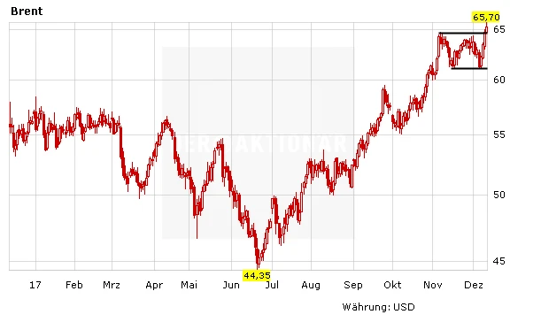 Entgegen diverser Unkenrufe helfen die von der OPEC nun bis Ende 2018 verlängerten Förderkürzungen den Ölpreisen, die weiter zulegen können. So ist der Preis für ein Barrel der Nordseesorte Brent nach der Schließung eines Pipeline-Systems vor der schottischen Küste erstmals seit 2015 auf 65 Dollar gestiegen.