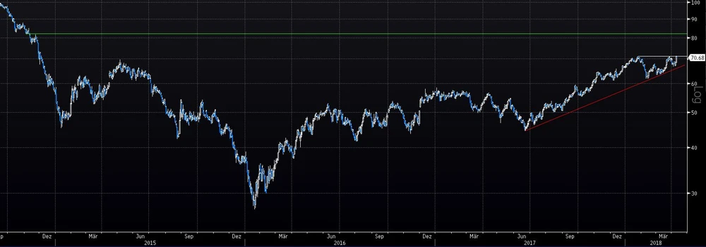 Ein weiterer Grund für anziehende Kurse ist auch die Sorge der Investoren, dass Trump tatsächlich den Atom-Deal mit dem Iran aufkündigt. Nachdem er offenbar auf seiner Strichliste die Punkte Steuersenkungen und (hoffentlich bald auch) Importzölle „abgearbeitet“ hat, könnte nun der seiner Ansicht nach „schlechteste Deal aller Zeiten“ an der Reihe sein. Da der Iran mittlerweile auf dem Ölmarkt wieder ein gewichtiger Player geworden ist, dürften neuerlichen Sanktionen gegen das Land dem Ölpreis einen weiteren Schub geben.