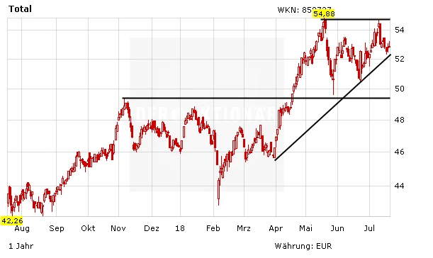 Total hat diesen Schritt sogar schon vollzogen: Nachdem 2017 die Quartalsausschüttungen von 0,61 auf 0,62 Euro erhöht wurden, folgt nun der Schritt auf 0,64 Euro. Der Ex-Tag ist bei Total allerdings erst der 25. September. Ausgeschüttet wird dann am 12. Oktober.