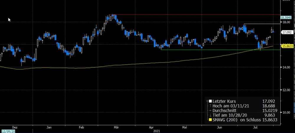 Derzeit bewegt sich der Kurs seit mehreren Wochen in einem Seitwärtstrend. Nach unten sollten Anleger darauf achten, ob der mehrfach getestete Unterstützungsbereich zwischen 15,40 und 15,50 Euro weiterhin hält.