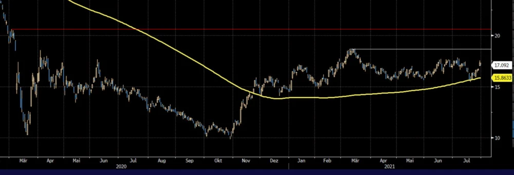 Im Auge behalten sollte man aber auch das Zwischenhoch bei 17,82 Euro. Sollte der Sprung darüber gelingen, gilt es anschließend, auch das bisherige Jahreshoch bei 18,69 Euro zu überwinden. Dadurch wäre der Weg nach oben vorerst frei.