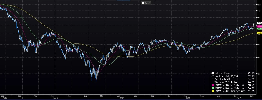 WTI-Öl kostete in der Spitze gestern 73,06 Dollar, so viel wie zuletzt Ende November 2014 (siehe Chart unten). Der Preis für ein Barrel der Nordseesorte Brent kletterte zwischenzeitlich bis auf 78,16 Dollar und liegt somit nur noch knapp unter dem Mehrjahreshoch von 80,50 Dollar.