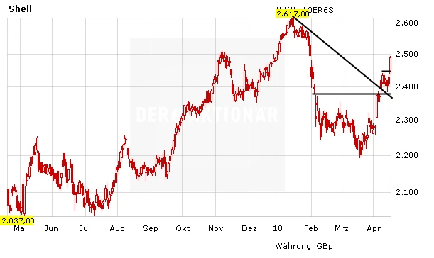 Auch die Aktie von Shell hat ein neues Kaufsignal generiert. Die Chancen stehen nun gut, dass es bald zu einem neuen Angriff auf das bisherige Jahreshoch bei 2.617 Britische Pence (umgerechnet 30,11 Euro) kommen wird. Die Aktie des hochprofitablen Konzerns, der zudem mit einer konstant hohen Dividende lockt, bleibt daher weiterhin ein klarer Kauf (Stoppkurs: 23,00 Euro).