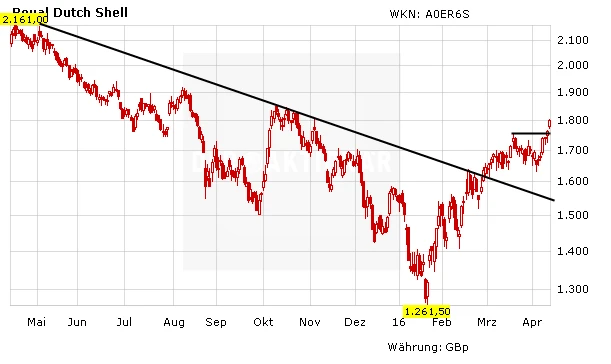 Denn nachdem dem Kurs kürzlich bereits der Ausbruch aus dem langfristigen Abwärtstrend sowie über die 200-Tage-Linie geglückt ist, wurde nun auch der horizontale Widerstand bei 1.760 Britische Pence übersprungen. Nun hätte die Aktie des Energieriesen wieder reichlich Luft nach oben.