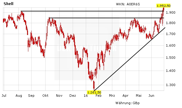 Dieser Meinung sind auch die Experten von HSBC, welche die Shell-Papiere unverändert mit „Buy“ einstufen (wie übrigens auch die Experten von Goldman Sachs). Zudem wurde das Kursziel von 2.000 auf 2.150 Pence (umgerechnet 25,90 Euro) angehoben. Auch aus charttechnischer Sicht wäre diese Marke durchaus zeitnah realisierbar. Denn nachdem sich der Kurs trotz des Brexit-Schocks über dem wichtigen Widerstand von 1.850 Pence halten konnte, wäre der Weg nach oben zunächst frei. Weitere Unterstützung bringt indes der steigende Ölpreis, der heute im frühen Handel weitere 0,7% zulegen kann.