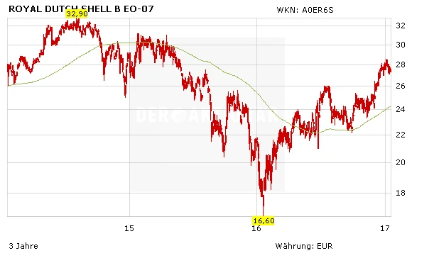 DER AKTIONÄR hält weiter an der Kaufempfehlung für die Aktie von Royal Dutch Shell fest. In diesem Jahr sollten sich das höhere Ölpreisniveau sowie Kostensenkungen positiv auf das Konzernergebnis niederschlagen. Die Bewertung ist mit einem KGV von 14, einem KBV von 1,1 und allen voran einer Dividendenrendite von 6,8 Prozent nach wie vor günstig. Der Stopp sollte bei 20,50 Euro belassen werden.