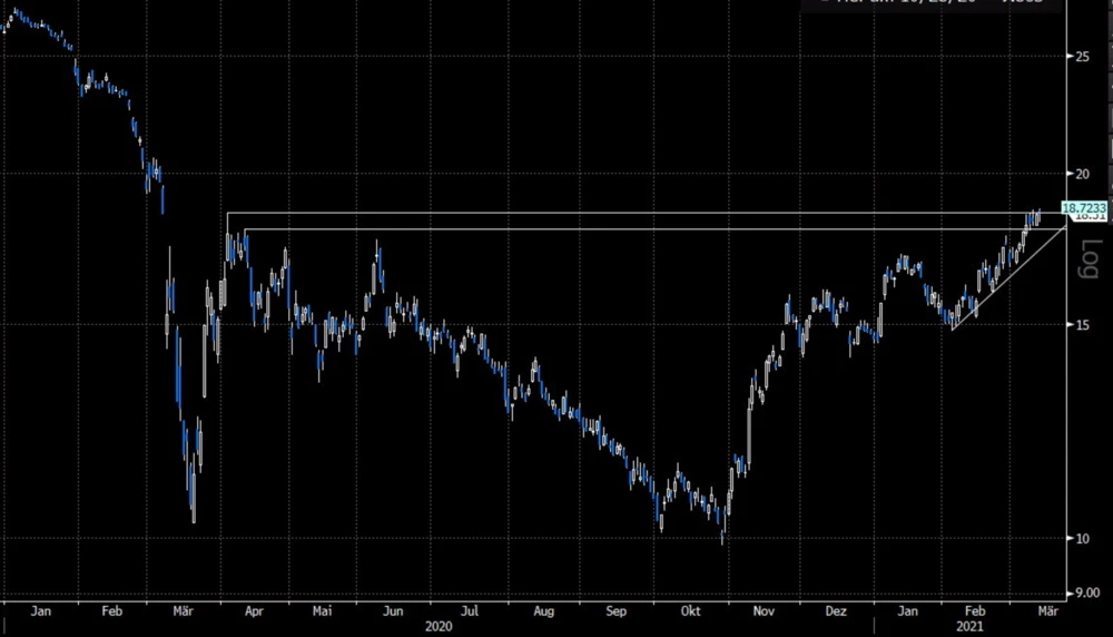 Der Kurs hat seit Anfang Februar einen soliden Aufwärtstrend ausgebildet. Im Zuge dessen wurden auch einige Widerstandsmarken relativ problemlos aus dem Weg geräumt. Nun wäre der nächste Schritt, das bisherige Corona-Hoch bei 18,57 Euro zu überwinden. Dann wäre der Weg nach oben rein charttechnisch betrachtet zunächst frei bis in den Bereich um 24 Euro.