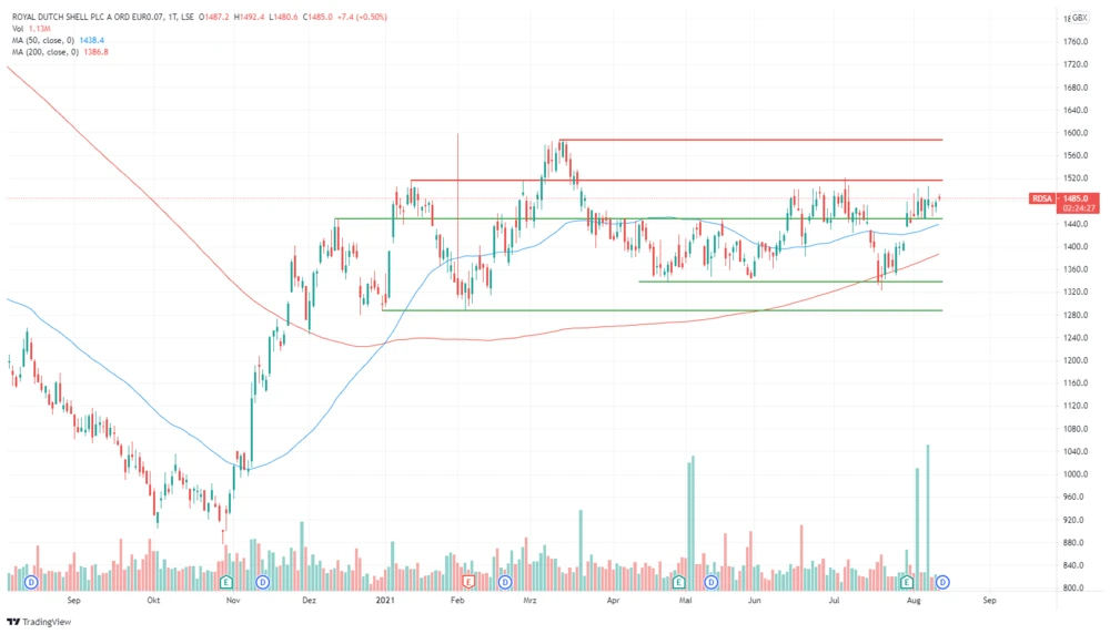 Zwischen November und Januar setzte die Shell-Aktie zu einem kräftigen Erholungsversuch an. Nach dem 72-prozentigen Sprint auf ein Hoch bei 1.516,20 Pence ging dem Titel aber die Luft aus. Daraufhin bewegte er sich anfänglich in einer Range zwischen diesem Hoch auf der Oberseite und der 1.300-Pence-Marke auf der Unterseite.