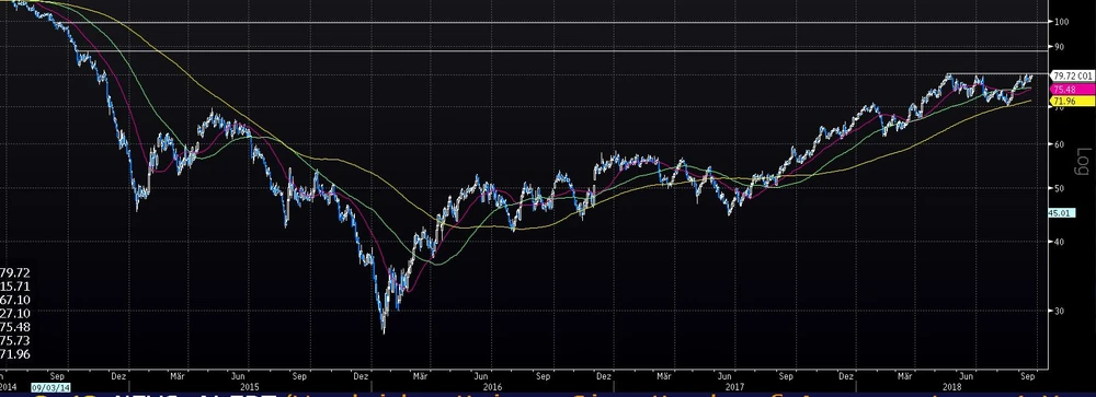 …und zwar der Kurs von Brent-Öl (das Chartbild von WTI-Öl sieht ebenfalls relativ bullish aus). Denn dieser notiert nach dem jüngsten Anstieg nur noch ein knappes Prozent unter dem bisherigen Mehrjahres-Hoch bei 80,50 Dollar. Sollte diese Marke nun endlich geknackt werden, wäre der Weg nach oben zunächst frei. Auf dem Weg in den Bereich um die 100-Dollar-Marke gäbe es dann eigentlich nur noch einen hartnäckigeren Widerstand zu nehmen. Dieser liegt bei 87,94 Dollar.
