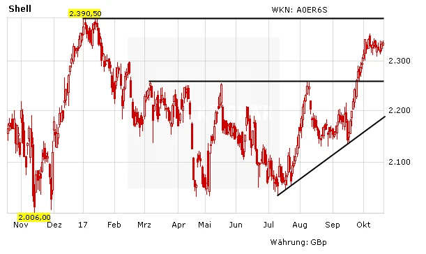 Zwar befindet sich der Kurs aktuell noch in einer kleineren Konsolidierungsphase. Diese ist nach dem deutlichen Anstieg nach dem erfolgten Ausbruch über einen hartnäckigen Widerstand aber charttechnisch betrachtet durchaus gesund. Die Chancen stehen jedenfalls gut, dass die Aktie bald wieder Fahrt aufnimmt. Der nächste Widerstandsbereich liegt nun bei 2.390 Britische Pence (umgerechnet rund 26,80 Euro). Wird auch diese Hürde genommen, wäre der Weg nach oben vorerst frei. Danach wäre sogar ein Test der Marken von 2.580 und 2.613,50 Pence (dem bisherigen Allzeithoch) denkbar.