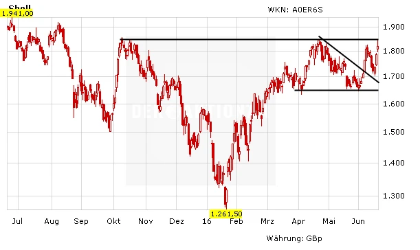 Gestern gingen die Shell-Anteilscheine bei 1.819 Britischen Pence aus dem Handel, notierte aber zwischenzeitlich schon bei 1.845 Pence. In genau diesem Bereich liegt eine hartnäckige Widerstandszone. Glückt nach dem Ausbruch aus dem kurzfristigen Abwärtstrend nun auch noch der Sprung über das Zwischenhoch vom Oktober 2015 bei 1.857 Pence, sollte der Weg nach oben aber vorerst frei sein. Die nächste Hürde liegt dann erst wieder bei 1.920 Pence (umgerechnet 24,70 Euro). Allerdings wäre auch ein kleiner Rücksetzer nach dem starken Kursanstieg der vorangegangen Handelstage durchaus als gesund zu werten.