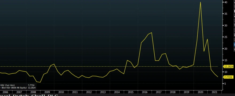 So dürfte sich das KGV für das laufende Jahr auf lediglich 8 belaufen. Günstiger bewertet waren die Shell-Anteile zuletzt Ende 2008 im Zuge der Lehman-Pleite. Das historische Durchschnitts-KGV (gestrichelte Linie) liegt indes bei rund 12.