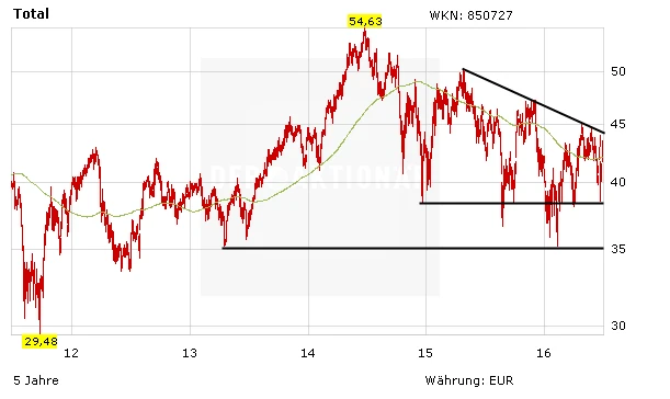 Das Kursziel wurde jedoch auf 49 Euro belassen. Analyst Martijn Rats begründete sein neues Anlageurteil damit, dass die Aktie in den vergangenen Jahren sehr gut gelaufen sei. Seit Mitte 2013 sei Total ein Kernbestandteil seiner mit "Overweight" bewerteten Aktien gewesen, dagegen schätzt er persönlich nun Shell und BP derart positiv ein. Die Shell-Papiere stuft er aktuell weiter mit „Overweight“ ein. Das Kursziel lautet unverändert 2.280 Britische Pence, was elf Prozent über dem gestrigen Schlusskurs liegt.