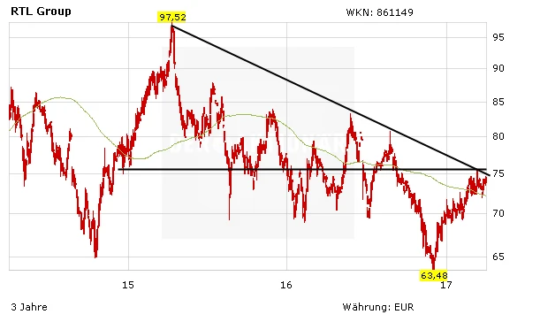 Die RTL-Aktie kann am Donnerstagnachmittag fast ein Prozent zulegen und nähert sich damit dem seit rund zwei Jahren gültigen Abwärtstrend. Ein Ausbruch wäre ein Kaufsignal und dürfte dem Kurs Rückenwind für den Sprung über den Widerstand im Bereich von 46 Euro geben.
