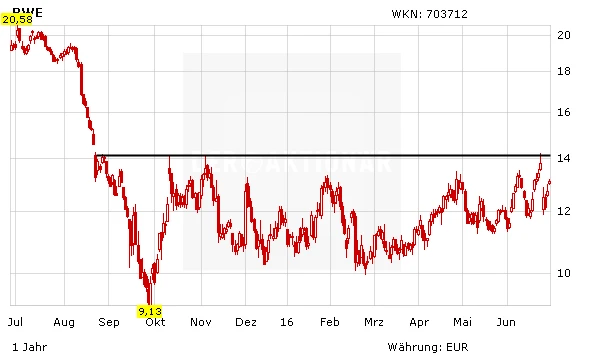 DER AKTIONÄR favorisiert bei den heimischen Versorgern derzeit die RWE-Aktie und spekuliert im Real-Depot mit einer Trading-Position auf steigende Kurse. Mit dem frischen Rückenwind von Politik und Analysten dürften die Papiere weiter Kurs auf den charttechnischen Widerstand bei 14 Euro nehmen.