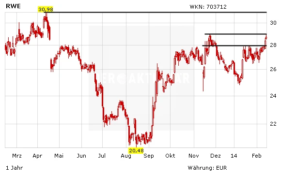Mit dem Ausbruch über die 28-Euro-Marke wurde ein massives Kaufsignal ausgelöst. Für Unterstützung sorgen zudem die Zahlen des französischen Versorgerkonzerns Electricite de France (EdF), die mit einer überraschend guten Gewinnentwicklung glänzen konnten. Die nächste Hürde im Chart wartet nun bei 29 Euro. Darüber wäre die Luft bis zum 52-Wochenhoch bei 31 Euro frei.
