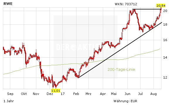 Charttechnisch sieht das Bild bei RWE ebenfalls glänzend aus. Nach der Rallye zu Jahresbeginn war die Aktie Ende Juni in eine Konsolidierungsphase übergegangen. Mit dem Sprung über das alte Jahreshoch bei 20,39 Euro konnte diese Phase überwunden werden. Nach oben ist der Weg jetzt frei bis zum Widerstand aus dem Jahr 2015 bei 21,70 Euro.