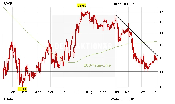 Zu Jahresbeginn pendelt der Kurs der RWE-Aktie weiter um die 12-Euro-Marke. Die Ankündigung, dass der Konzern die Kosten für die Atommüll-Endlagerung auf einen Schlag zahlen will, hat keinen Schwung verliehen. Für die DZ Bank bleibt der Versorger dennoch eine Kaufempfehlung.