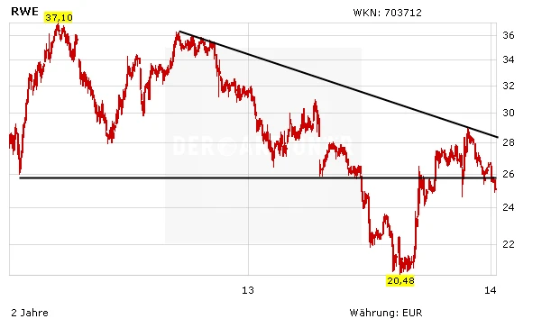 Auch charttechnisch hat sich die Situation bei RWE wieder deutlich verdüstert. Während der langfristige Abwärtstrend seit August 2012 nach wie vor intakt ist, wurde die Unterstützung bei knapp 26 Euro inzwischen deutlich durchbrochen.