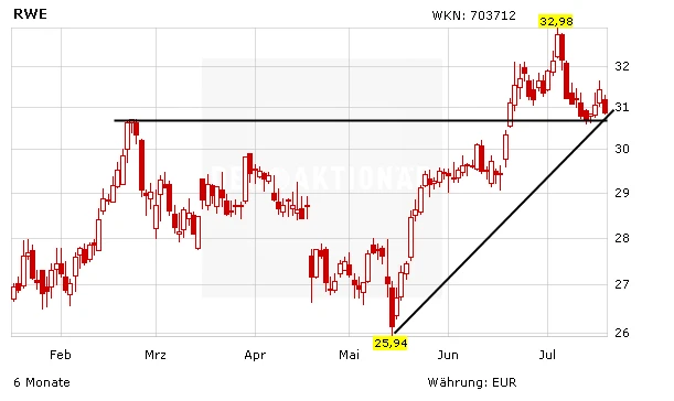 Nach der fulminanten Rallye in den letzten Monaten musste die RWE-Aktie zuletzt einen leichten Rückschlag hinnehmen. Der Wert ist wieder unter den Widerstand bei der 32-Euro-Marke gefallen. Die Analysten von Goldman Sachs und des US-Analysehauses Bernstein Research bleiben dennoch optimistisch für die weitere Entwicklung der Aktie.