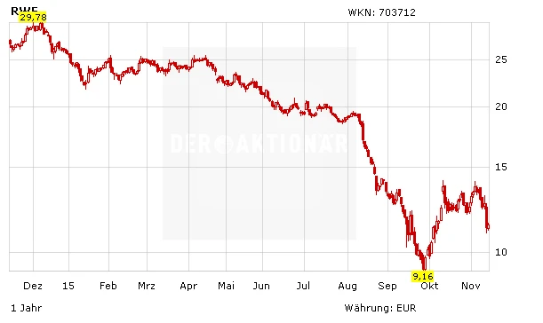 Nachdem RWE am Donnerstag schwache Quartalszahlen präsentiert und die ohnehin maue Jahresprognose mit einem dicken Fragezeichen versehen hat, ist die Aktie zwischenzeitlich um mehr als zehn Prozent abgesackt.