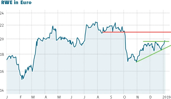 Im schwachen Gesamtmarkt zählen Versorger traditionell zu den stärksten Werten im DAX. Auch RWE hat das in den vergangenen Wochen wieder unter Beweis gestellt. Zum Ende der ersten Handelswoche im neuen Jahr ist die Aktie sogar auf den höchsten Stand seit Anfang Oktober geklettert – damals wurden die Rodungspläne am Hambacher Forst gerichtlich gestoppt.