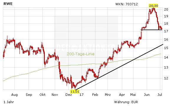 Im Bereich von 17,40 Euro arbeitet die RWE-Aktie derzeit an einer Bodenbildung. Nach der steilen Rallye in den ersten Monaten des Jahres hat der DAX-Titel zuletzt in kurzer Zeit über zehn Prozent verloren. Positiv: Die Befreiung von den Altlasten schreitet voran. Es wird aber auch deutlich, dass der Atomdeal Folgen hat.