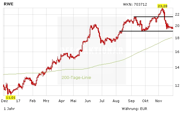 Trotz Beweisaufnahme: Es ist unwahrscheinlich, dass RWE tatsächlich verurteilt wird. Der Andensee ist auch früher bereits über das Ufer getreten und eine individuelle Zurechnung des Klimawandels scheint kaum möglich. Unabhängig davon, positioniert sich RWE weiter als Garant für Versorgungssicherheit. Steigende Strompreise und die Hoffnung auf Einführung eines Kapazitätsmarkts treiben die Aktie weiter an. Anleger setzen auf den Sprung über die 20,00-Euro-Marke, beachten aber den Stopp bei 18,00 Euro