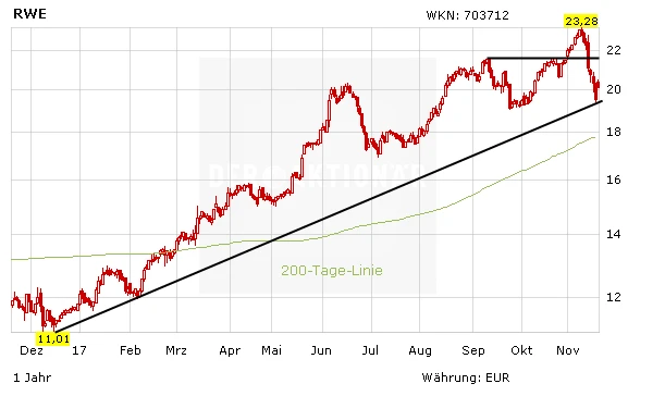 Im schwachen Marktumfeld zum Wochenstart führt die RWE-Aktie den DAX deutlich an. Der Versorger profitiert vom Platzen der Jamaika-Verhandlungen. Der schnelle Kohleausstieg, der von den Grünen gefordert wird, wird damit unwahrscheinlicher. Zudem beflügeln erneut Gerüchte um die Tochter Innogy.
