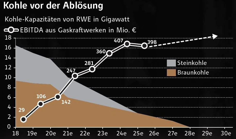 Als Übergangslösung für die Energiewende sind Gaskraftwerke aber perfekt. Diese lassen sich schnell herunter- und wieder hochfahren und ergänzen sich somit gut mit der schwankenden Ökostromproduktion. Für RWE ist das eine große Chance. Aktuell ist der Betrieb der Gaskraftwerke lediglich ein Nullsummenspiel, doch schon 2025 soll Gas laut Goldman rund 400 Millionen Euro operativen Gewinn beisteuern – und damit die entgangenen Gewinne aus dem Kohleausstieg zumindest abfedern können.