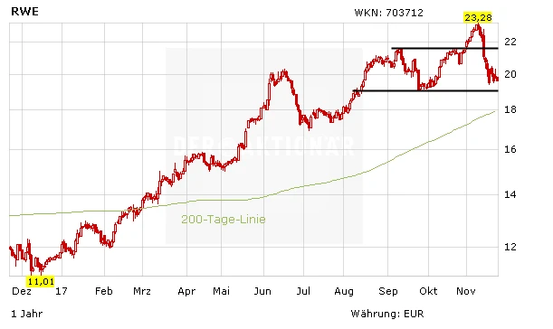 Fortum steht vor intensiven Gesprächen mit Uniper. Es bleibt offen, ob es zur Zerschlagung kommt, oder ob Fortum wirklich nur als stiller Investor einsteigt. Sollte sich eine Chance ergeben, dürfte RWE aber bereit stehen. Finanzielle Mittel könnten auch durch den Verkauf von Anteilen an der Tochter Innogy generiert werden. Spekulative Anleger setzen auf steigende Strompreise und die mögliche Einführung eines Kapazitätsmarktes. Der enge Stopp bei 19,00 Euro sollte aber beachtet werden.