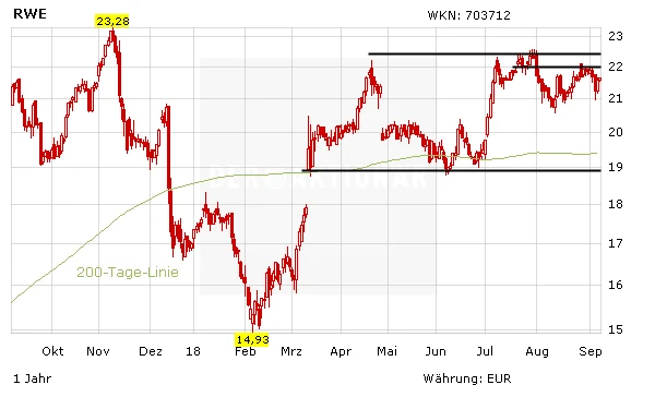 Im Gegensatz zu vielen anderen deutschen Werten sieht der Chart von RWE nach wie vor gut aus. Der Aufbau eines eigenen LNG-Terminals würde die Abhängigkeit von den Kohlekraftwerken weiter verringern. Mit der Rückbesinnung auf die erneuerbaren Energien hat sich der Konzern zuletzt bereits wieder eine eigene Zukunft gegeben. Anleger lassen die Gewinne laufen und setzen auf den Ausbruch über die 22-Euro-Marke.