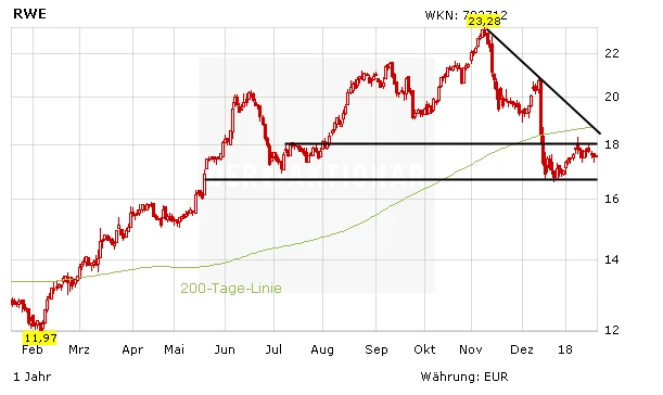 Die RWE-Aktie befindet sich seit der Innogy-Gewinnwarnung im Konsolidierungsmodus. Langfristig stimmen die Aussichten zwar. Als Garant für Versorgungssicherheit hat sich RWE stark positioniert, die Aussicht auf steigende Strompreise sollte Schwung verleihen. Aktuell fehlen aber die Impulse. Anleger sollten deshalb abwarten. Erst oberhalb des Widerstands bei 19,00 Euro bietet sich ein Neueinstieg an.