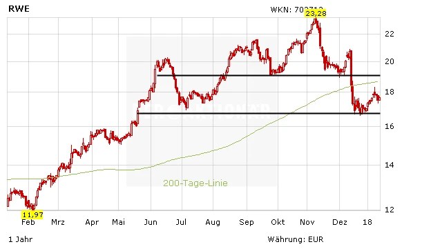RWE betreibt rund 60 Prozent der gesamten deutschen Braunkohleleistung. Angst vor einem schnellen Ausstieg hat der Konzern aber nicht. Zu Recht: Ohne Kohle wäre die Versorgungssicherheit nicht mehr garantiert. Die Anlagen von RWE dürften deshalb länger benötigt werden als ursprünglich gedacht, auch die Einführung eines Kapazitätsmarkts erscheint möglich. Die Aktie hat sich nach der Innogy-Gewinnwarnung wieder stabilisiert. Ein Neueinstieg bietet sich aber erst oberhalb des Widerstandes bei 19,00 Euro an.