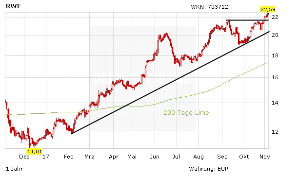 RWE hat seine Bilanz bereits deutlich aufpoliert. Damit stehen auch wieder Zukäufe zur Debatte. Die konventionellen Kraftwerke dürfte noch länger benötigt werden als zunächst gedacht. Für Schwung sorgen aktuell vor allem steigende Strompreise und die Hoffnung auf einen Kapazitätsmarkt. Risikobewusste Anleger setzen weiter auf steigende Kurse. Dank des starken Chartbilds ist es auch für Neueinsteiger noch nicht zu spät.