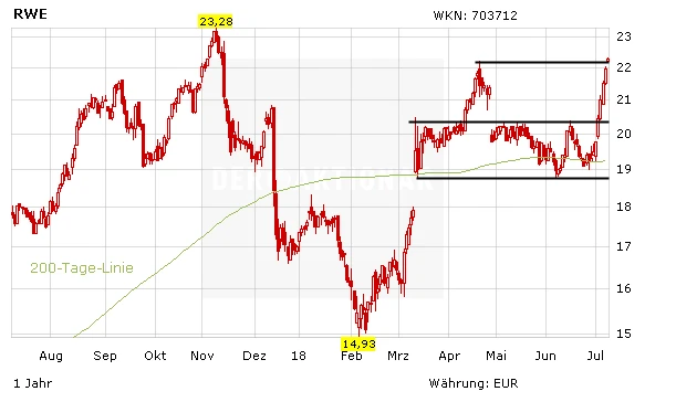 Der Analyst hat RWE deshalb von „Outperform“ auf „Top Pick“ hochgestuft. Das Kursziel bestätigte Musk bei 26 Euro. Nachdem vor dem Wochenende auch die Credit Suisse RWE bereits auf die „EMU Top Picks“-Liste gesetzt hatte, ist kurzzeitig erstmals wieder der Sprung über den Widerstand bei 22,20 Euro gelungen. Der nächste Halt liegt nun beim Zwischenhoch aus dem November 2017 bei 23,28 Euro.