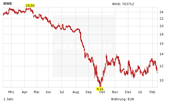 Auch für die RWE-Papiere hat Steele die Halteempfehlung gestrichen und rät nun, den Versorger-Titel zu verkaufen. Das Kursziel für die Nummer 2 auf dem deutschen Energiemarkt hat er von 14 auf 10,50 Euro gesenkt.